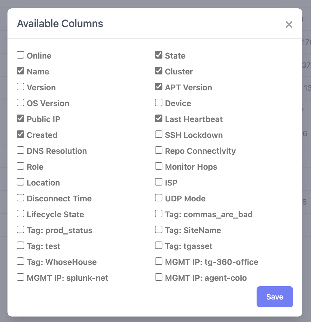 | Online | Shows if the node is currently connected to the Trustgrid control plane. Can be used to sort by online/offline status. |